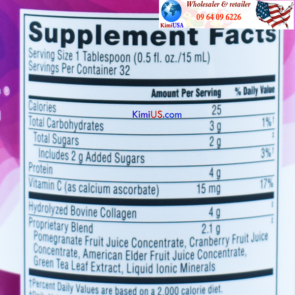 Đây là Collagen C của Mỹ dạng nước, hương trái cây, được chiết xuất từ tinh chất thiên nhiên như: hạt quả lựu, quả việt quất và quả cây cơm cháy.