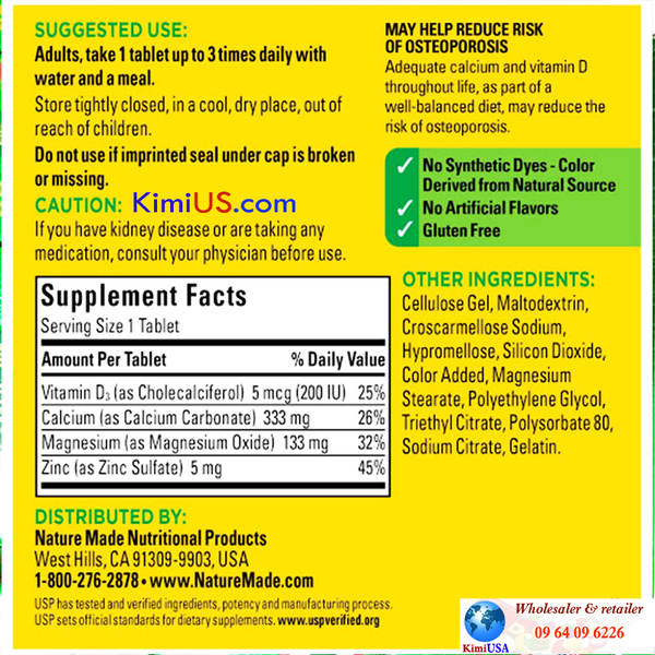 Viên uống Nature Made Calcium Magnesium Zinc cung cấp một làm lượng lớn các Vitamin và các khoáng chất khác cần thiết cho sự duy trì và phát triển của cơ thể, giúp chống lại quá trình loãng xương và răng.